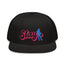 Slay all day in this classic fit, flat brim snapback with a subtle grey under visor, featuring an anime girl graphic.